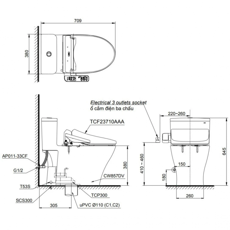 Bồn Cầu Điện Tử TOTO MS857DW18 Nắp Rửa Washlet TCF23710AAA C2
