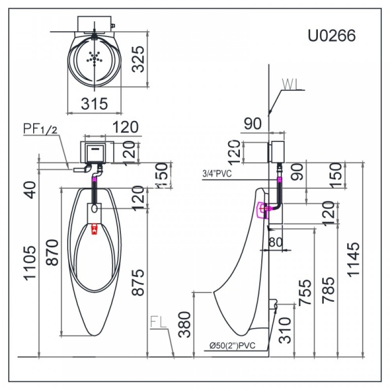 Bồn tiểu U0264 treo tường có thể lắp đặt với các van xả tiểu sau: A637, A648, A654, A673...