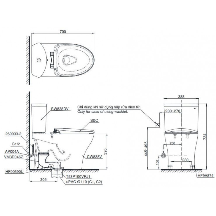 Bồn Cầu Điện Tử TOTO CS838CDW17 Nắp Rửa Washlet TCF23460AAA C2 Giấu Dây