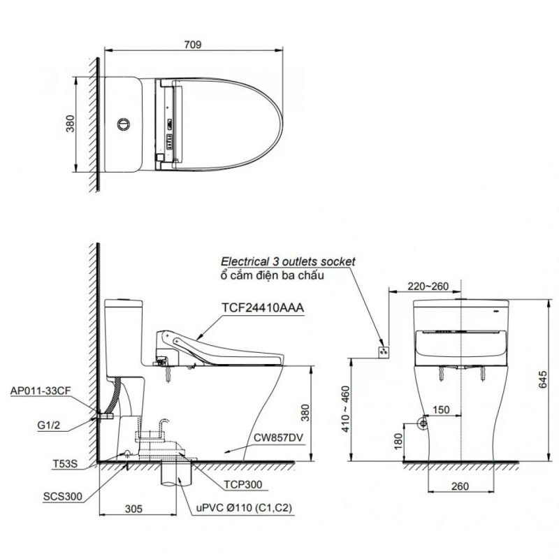Bồn Cầu Điện Tử TOTO MS857DW14 Nắp Rửa Washlet TCF24410AAA C5
