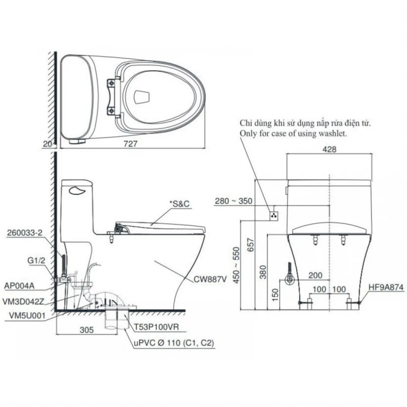 Bồn Cầu Điện Tử TOTO MS887CRW23 Nắp Rửa Washlet TCF47360GAA S7 Giấu Dây