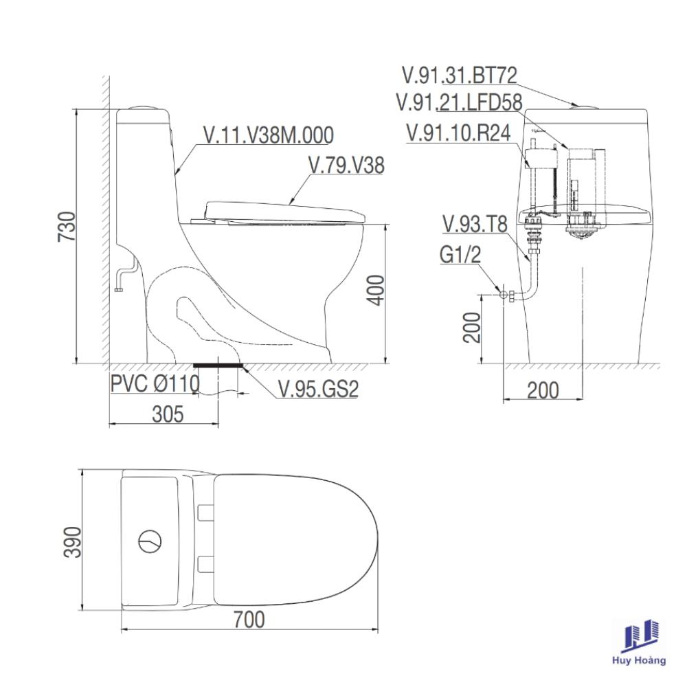 Bồn Cầu Viglacera V38M Nắp V38M + Vòi Xịt VG826 Xả Xoáy