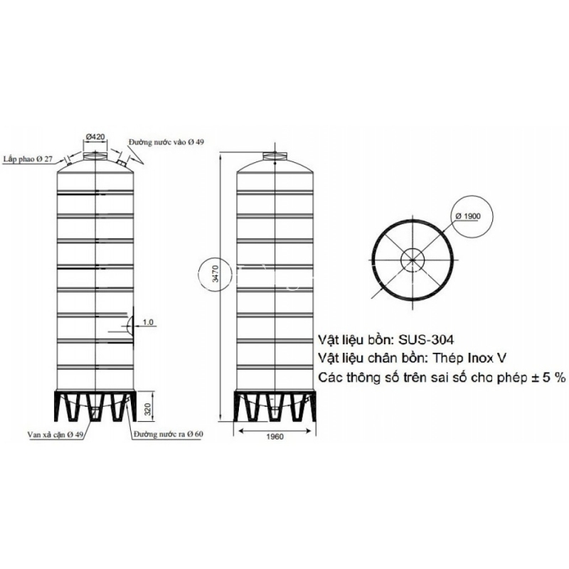 Bồn Nước Đại Thành Inox 10000L Đứng SUS 304 Ø1,9m