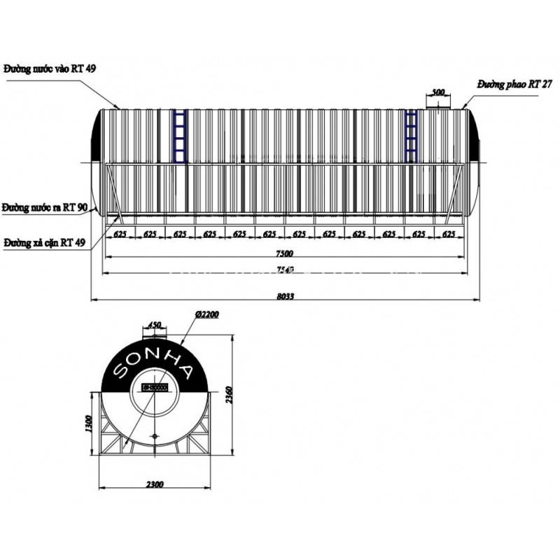 Bồn Nước Sơn Hà Inox 30000L Ngang SUS 304 Ø 2,2m