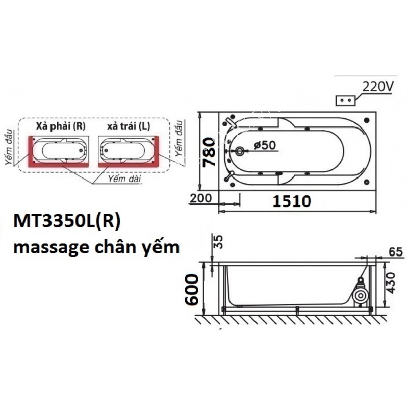 Thông tin cơ bản bồn tắm Caesar MT3350L/R massage chân yếm