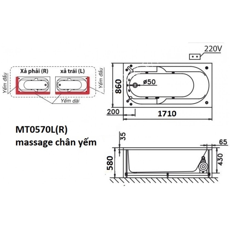 Thông tin cơ bản bồn tắm Caesar MT0570L/R massage chân yếm