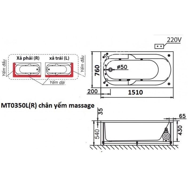 Thông tin cơ bản bồn tắm Caesar MT0350L/R massage chân yếm