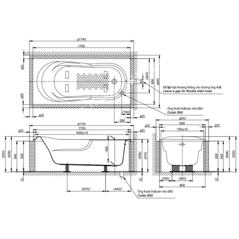 Bồn Tắm TOTO PAY1770DH/TVBF411 Xây 1.7M