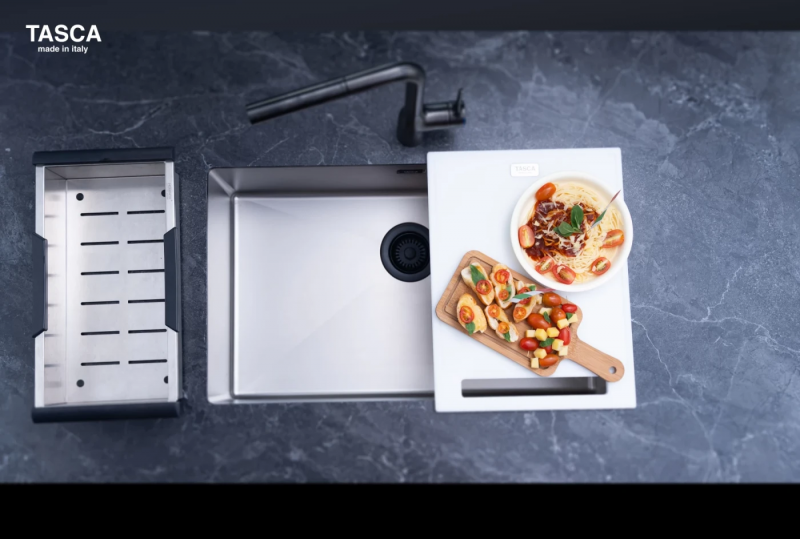 Đi kèm với chậu là khả năng tích hợp nhiều phụ kiện bếp thiết yếu (có thể mua riêng), mở rộng đáng kể công năng sử dụng. Các phụ kiện như thớt nhựa giúp bạn sơ chế thực phẩm trực tiếp trên chậu, rổ inox tiện lợi để ngâm rửa rau củ hoặc bát đĩa, và khay inox để phân loại đồ dùng, giữ chúng khô ráo. Sự kết hợp giữa phương án lắp đặt linh hoạt và hệ sinh thái phụ kiện đa dạng này biến chậu rửa thành một trung tâm làm việc hiệu quả, có tổ chức, từ đó giúp cho mọi thao tác nấu nướng, sơ chế và dọn dẹp trở nên nhẹ nhàng, đơn giản và tiết kiệm thời gian hơn rất nhiều, nâng cao trải nghiệm và niềm vui vào bếp.