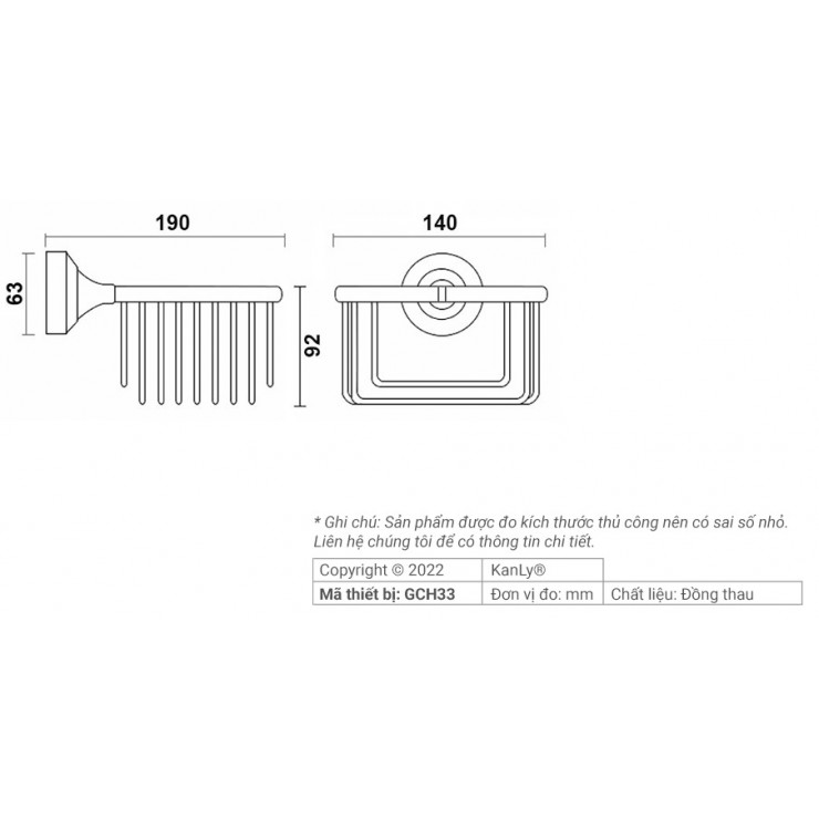Khay đựng giấy vệ sinh bằng đồng GCH33 có đường kính phủ bì khoảng 140mm, phù hợp chứa đựng vừa vặn các loại giấy vệ sinh với đa dạng kích cỡ khác nhau. Thiết bị có trọng lượng khoảng 510g, dày nặng, chất lượng, độ bền được đảm bảo khi sử dụng trong môi trường có nhiệt độ thấp, độ ẩm cao, dễ bị oxy hóa như phòng tắm, khu nhà vệ sinh.