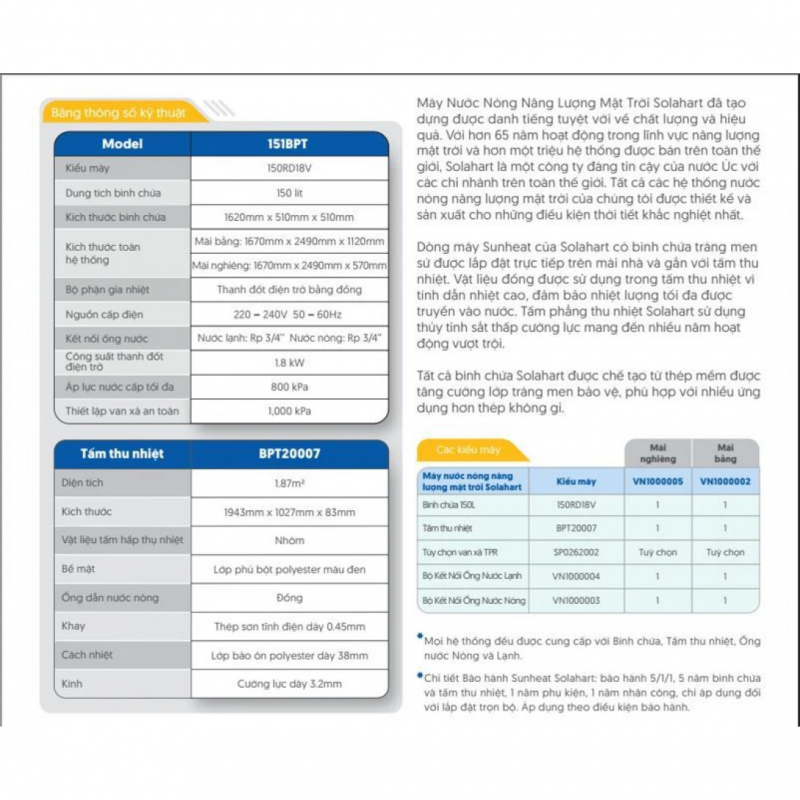 Máy Nước Nóng Năng Lượng Mặt Trời Solahart Sunheat 150 Lít Mái Bằng + Chân Thép + Lắp Đặt + Vật Tư