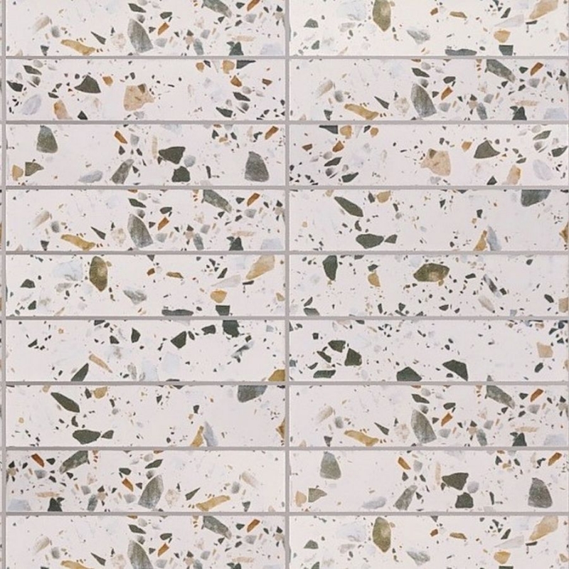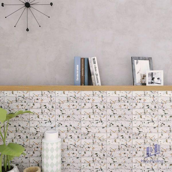 Ứng dụng: lót tường/sàn khu vực nhà vệ sinh, khu vực ẩm ướt.Terrazo là họa tiết được ưa chuộng hiện nay. Mosaic Terrazo là thiết kế đột phá từ gạch sàn Terrazo kích thước lớn. Phong cách thanh lịch, sang trọng và hiện đại càng cao trong các thiết kế nhỏ hình lục giác, hình thanh đũa. Các mẫu mosaic terrazo có thể sử dụng cho nhiều khu vực đều phù hợp đặc biệt là các khu vực cần ẩm thấp vì độ thấm hút nước rất thấp.