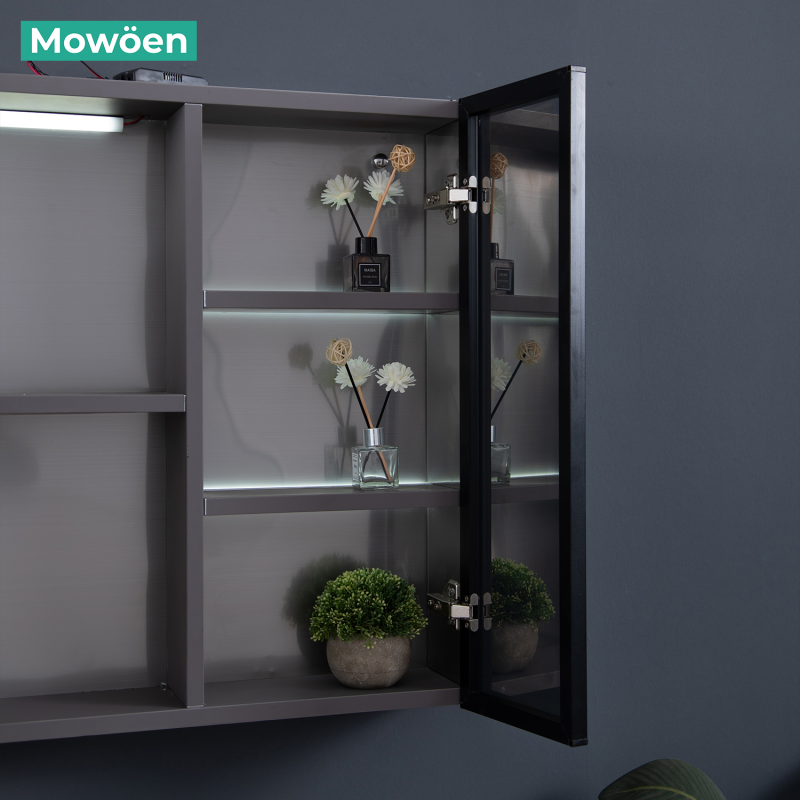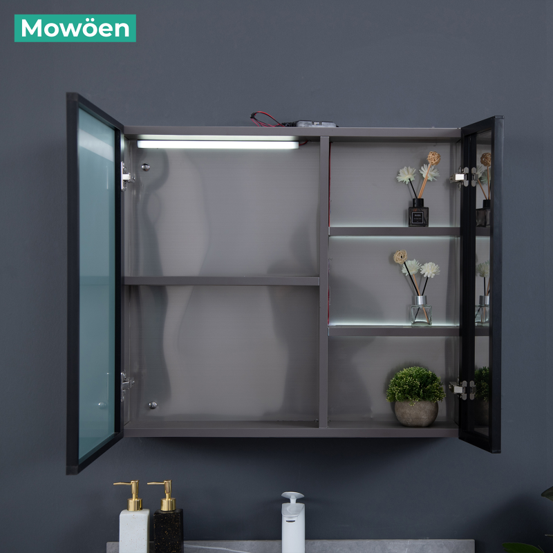 Tủ gương đi kèm với hệ cánh tủ mở, và các giá đỡ cung cấp không gian lưu trữ rộng rãi cho vật dụng cá nhân, kem đánh răng, xà phòng, đồ trang điểm và các đồ dùng khác.