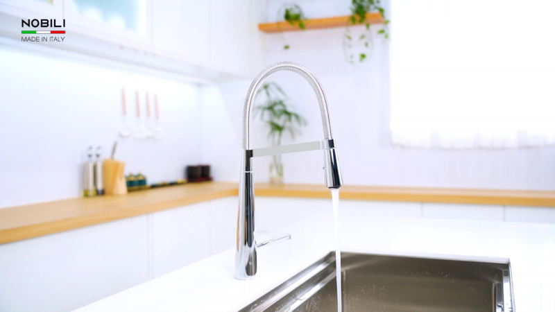 Vòi rửa bát cần mềm NOBILI LIKID NB880 được trang bị thân vòi xoay 360 độ, mang đến khả năng xoay chuyển linh hoạt và phạm vi tiếp cận rộng khắp khu vực chậu rửa. Bạn có thể dễ dàng điều chỉnh hướng dòng nước đến bất kỳ góc nào, giúp việc rửa rau, rửa bát hay làm sạch bề mặt chậu trở nên thuận tiện hơn bao giờ hết. Thiết kế này đặc biệt lý tưởng cho những không gian bếp bận rộn, tối ưu hóa thao tác và tiết kiệm thời gian cho người nội trợ.