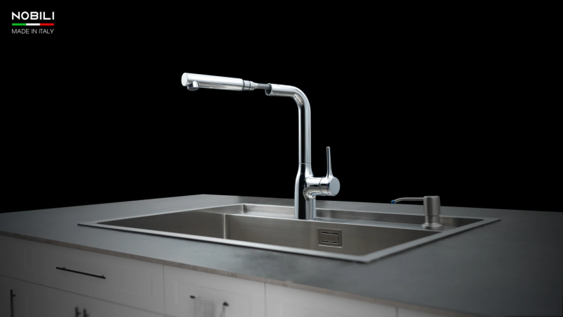 Đầu vòi của vòi rửa bát Nobili được thiết kế thông minh, có thể tháo rời dễ dàng chỉ với thao tác đơn giản. Nhờ đó, người dùng thuận tiện hơn trong việc vệ sinh, loại bỏ cặn bẩn, vôi hóa và bảo trì định kỳ, giúp duy trì áp lực nước ổn định và kéo dài tuổi thọ sản phẩm.