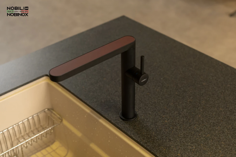 Bề mặt Velvet Black trên thân và Mora Matt ở mặt trên vòi rửa bát Nobili Match NB218B mang đến vẻ đẹp đen tuyền kết hợp với nâu trầm sang trọng với hiệu ứng mờ tinh tế, hoàn toàn không phản chiếu ánh sáng.