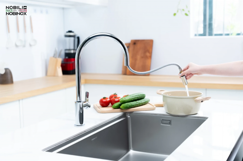 Các dòng vòi rửa bát nóng lạnh Nobili còn được trang bị bộ giới hạn nhiệt tích hợp – một giải pháp an toàn thông minh giúp kiểm soát nhiệt độ nước đầu ra, ngăn ngừa nguy cơ bỏng do nước quá nóng, đặc biệt hữu ích với gia đình có trẻ nhỏ hoặc người lớn tuổi.