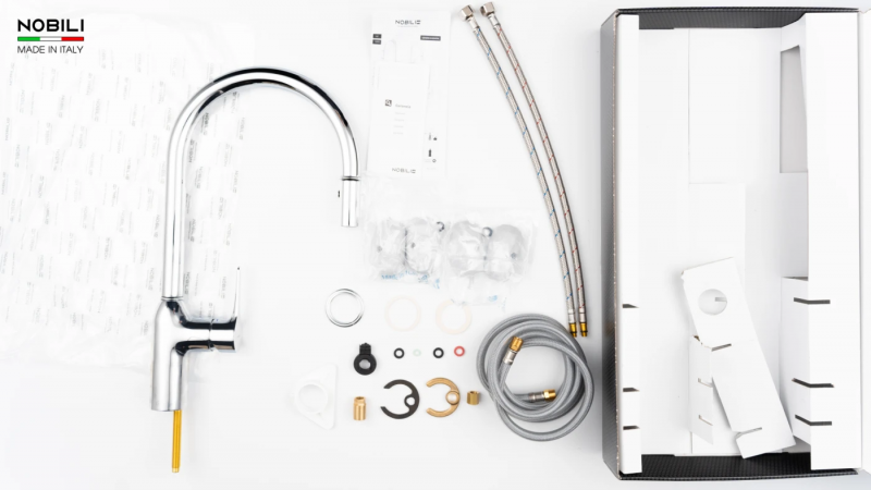 Vòi bếp Nobili được đúc nguyên khối bằng máy móc công nghệ cao tại Ý - theo một quy trình hoàn toàn khép kín. Hoàn thiện sản phẩm tại Ý kể cả với từng linh phụ kiện nhỏ nhất.