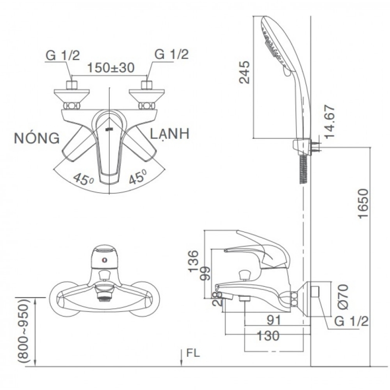 - Áp lực nước : 0.05 MPa ~ 0.75 MPa