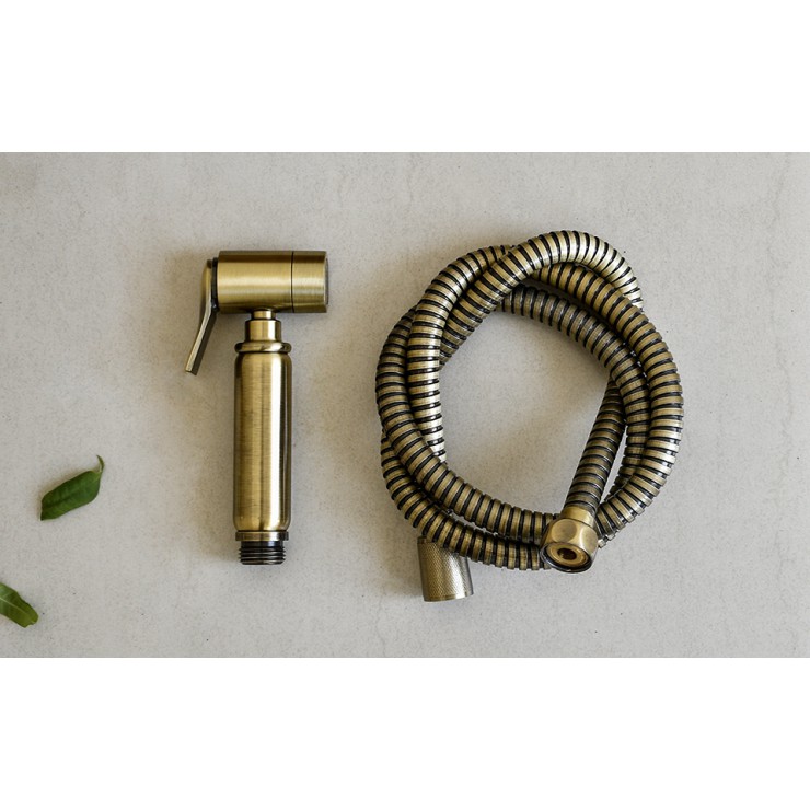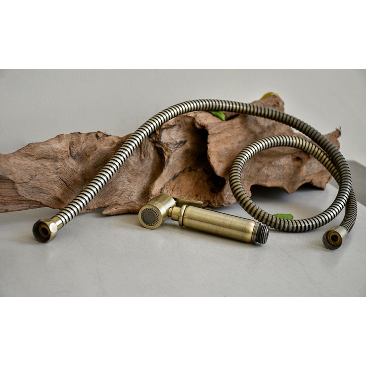 Bộ thiết bị gồm 1 đầu vòi, 1 dây cấp bọc đồng, 1 đế cài treo tường, 1 nắp che vít mỹ thuật, 2 đinh vít. Thiết bị được làm từ chất liệu đồng đúc dày chắc, hoàn thiện bề mặt màu đồng cổ tạo cảm giác mộc mạc gần gũi thân thiện sạch sẽ và dễ dàng vệ sinh.