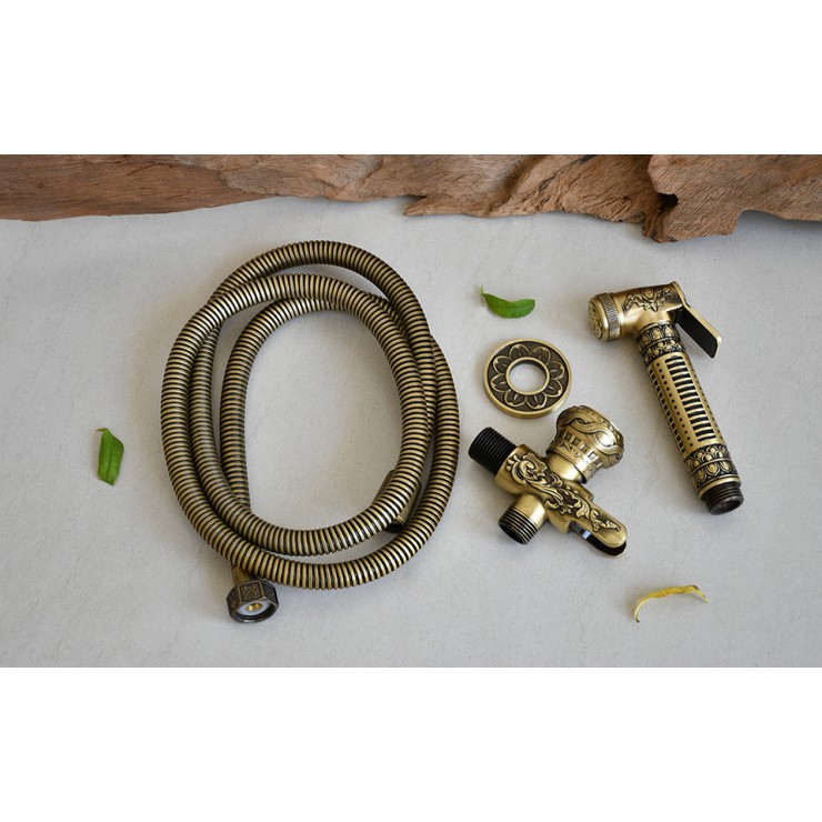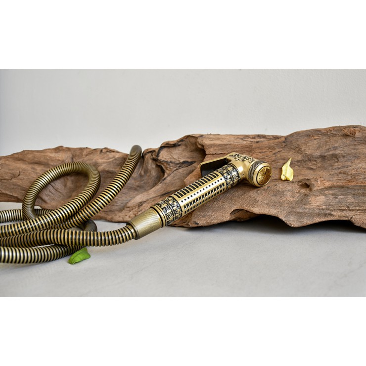 Vòi xịt rửa cổ điển đồng thau GCK23 được thiết kế kiểu hoa văn họa tiết cầu kỳ, mang phong cách sang trọng, hoàng gia, phù hợp cho không gian nội thất phòng tắm theo xu hướng cổ kính, tông màu nâu ấm.